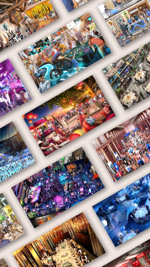 Mon travail transforme lieux et événements en univers interactifs, où le public devient acteur à travers fresques immersives, installations narratives et dispositifs participatifs. Chaque projet est pensé comme une mise en scène visuelle : un équilibre entre image, espace et mouvement pour captiver, surprendre et engager le public.