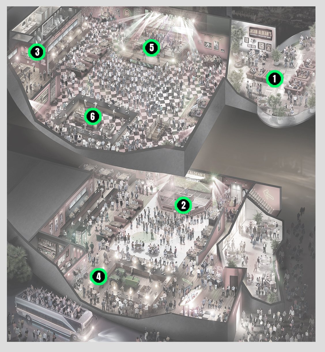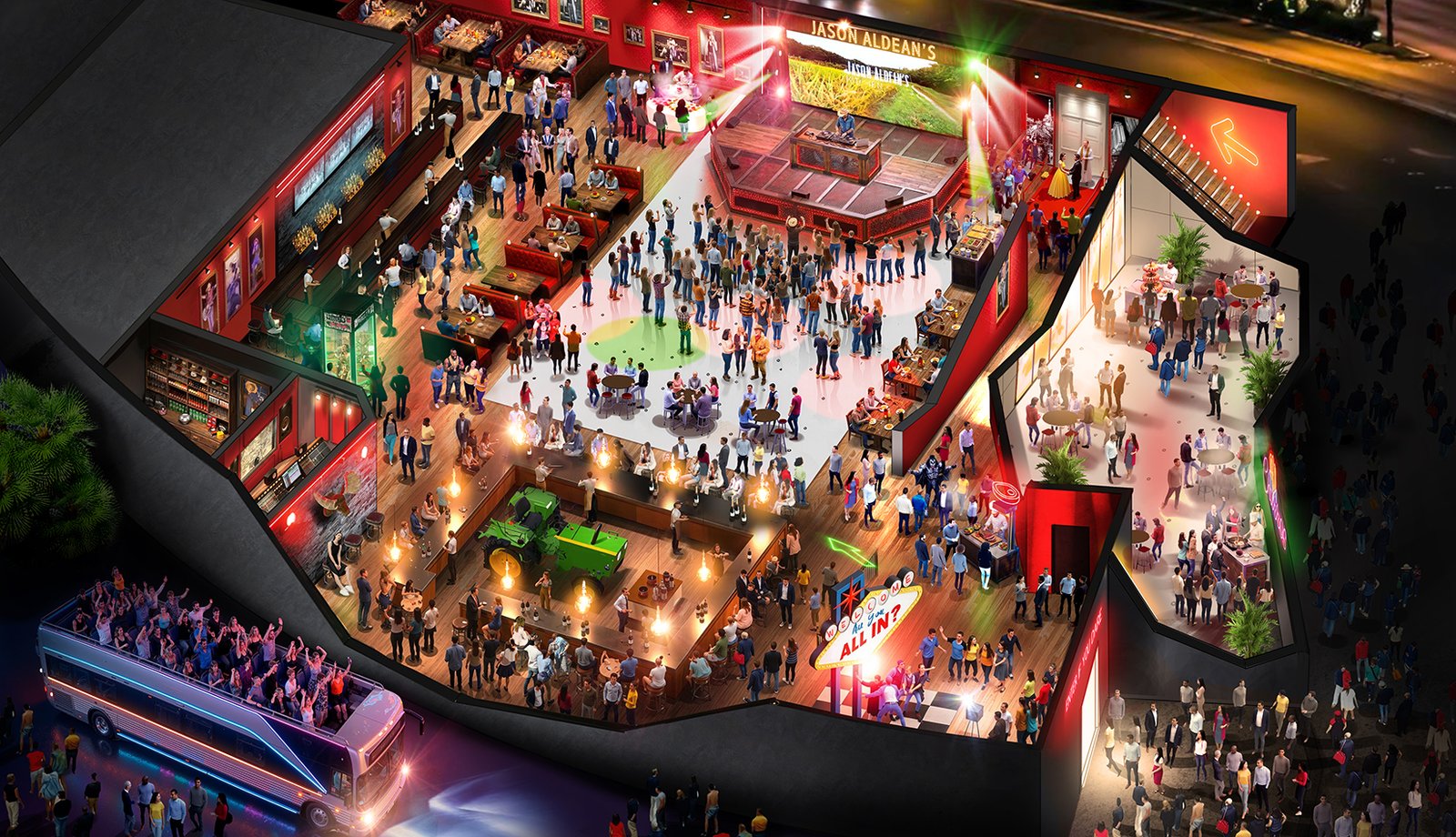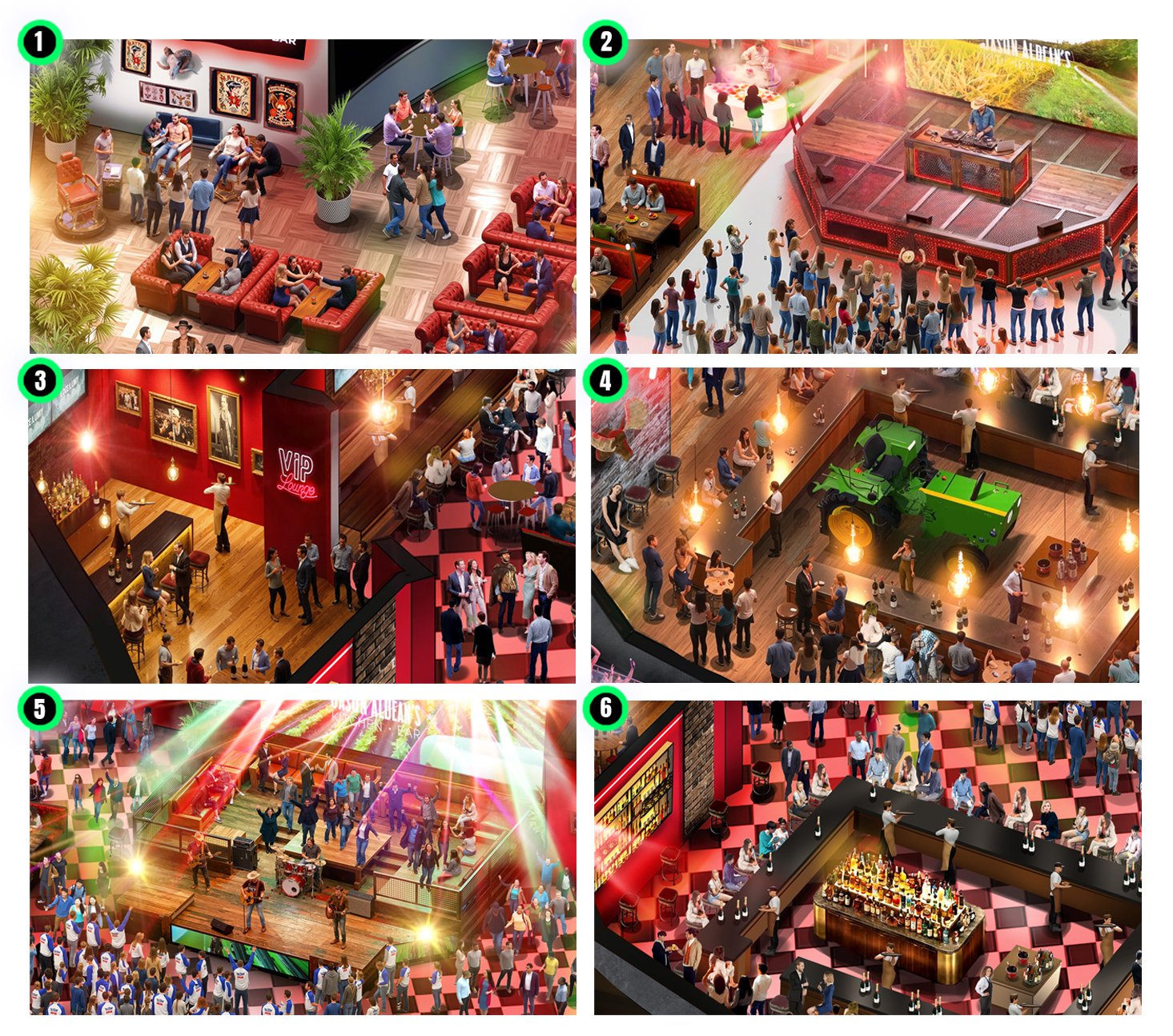 Nouvelle déclinaison de la fresque narrative immersive conçue pour McDonald’s, cette fois déployée au Jason Aldean’s Kitchen + Bar à Las Vegas. Situé en plein cœur du Strip, ce lieu iconique sur deux niveaux conjugue l’énergie vibrante de Las Vegas à l’esthétique chaleureuse et authentique d’un grand bar country américain : bois brut, néons, scène live, volumes généreux et atmosphère résolument festive. Un terrain d’expression idéal pour prolonger l’esprit “All-In”. Le dispositif scénographique a été repensé pour dialoguer avec l’architecture du lieu et exploiter sa verticalité. Répartie sur deux étages, l’expérience proposait un parcours immersif et foisonnant, composé de multiples espaces à découvrir : zones narratives, installations visuelles, points de rencontre et séquences expérientielles. Chaque espace incarnait une facette du storytelling, invitant les participants à s’engager pleinement dans l’expérience.