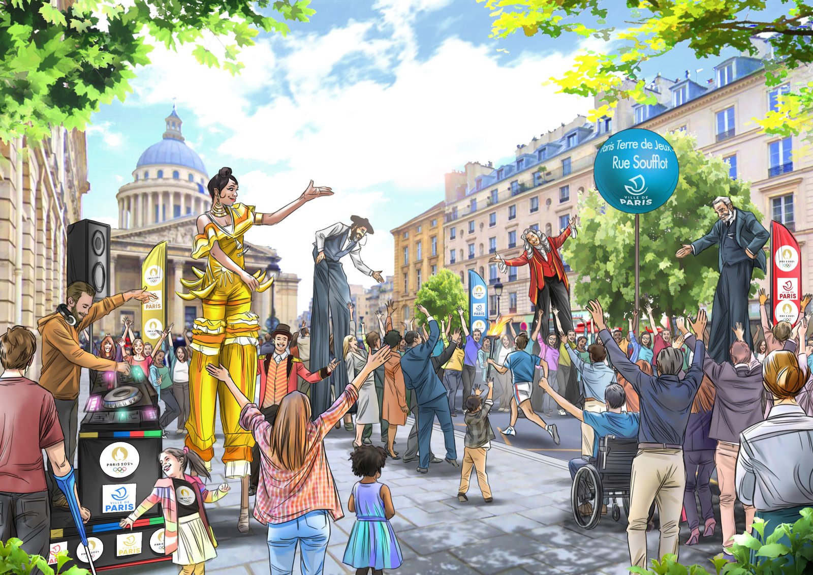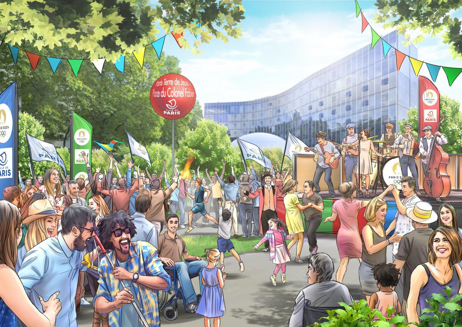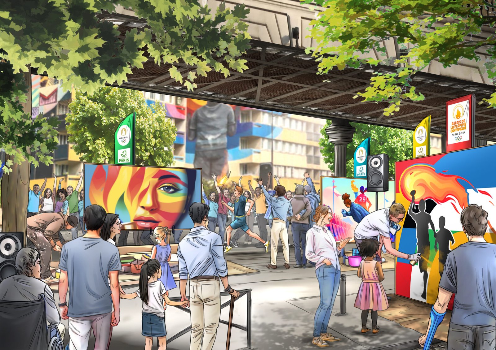 Le dispositif comprenait également cinq planches immersives illustrant différents espaces d’activation : zones d’animations sportives, ambiance guinguette, street art, performances artistiques et espaces de convivialité.